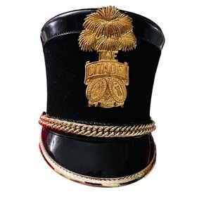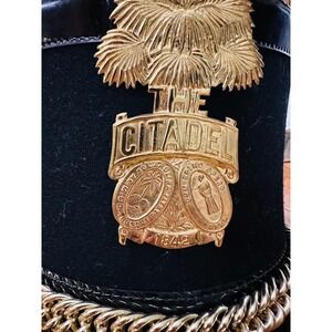 Keywords: Citadel, military, parade, hat, collectible, uniform, regalia, gold, suede, vintage, memorabilia, school spirit, costume, accessory