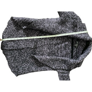 Pre-owned Slonl Petite PM cardigan in black and purple. Made of 35% wool. Features an open front, long sleeves, asymmetrical hem, and an oversized collar. Approximate measurements are listed in the photos however please reach out if you have any questions.