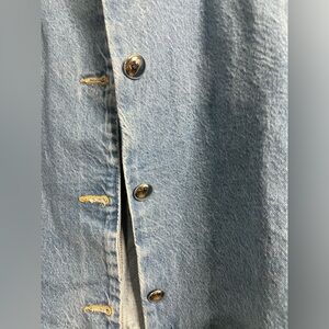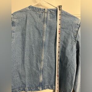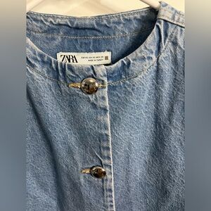 This item is a Zara collarless denim jacket, also described as a jean jacket, with silver buttons. It features a raw or distressed hem and a cropped length.