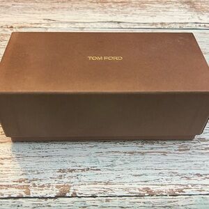 Tom Ford glasses case with Sophisticated chocolate brown box with gold Tom Ford logo. Ideal for gifting.