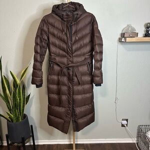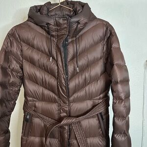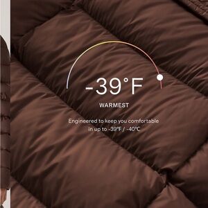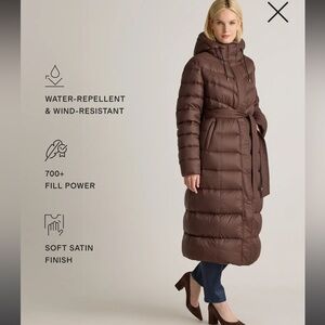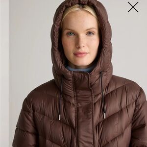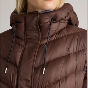 Elegant chocolate puffer jacket by Quince. Features a cozy hood and sleek design.