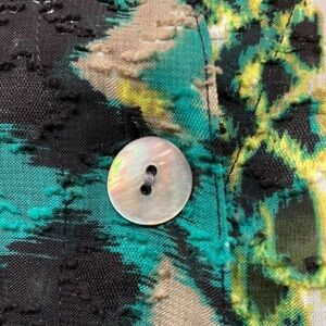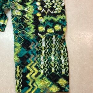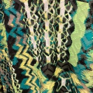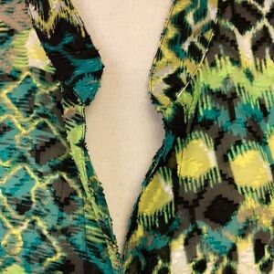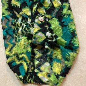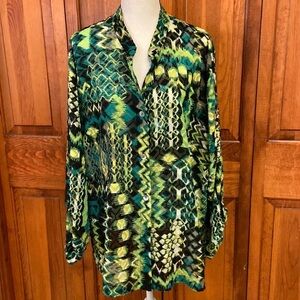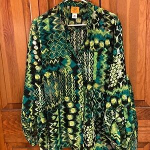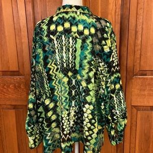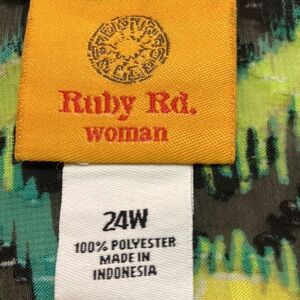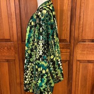Ruby Rd. shabby polyester v-neck button down in black/white/neon green/leaf green 29” length and 28.5” armpit to armpit. Size 24W in EUC