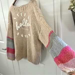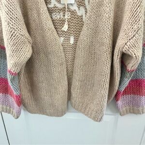 Saltwater Luxe Open Front Sweater Cardigan Tan with pops of color pink blue & green color stripes on the arm & embroidered graphic “Hello Sunshine” on back.