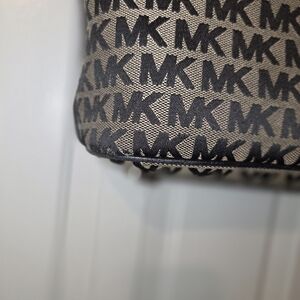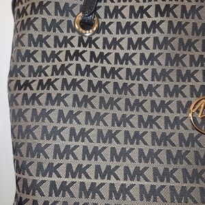 Elegant Michael Kors tote with signature MK pattern. Black handles and tan body. Ideal for daily use.