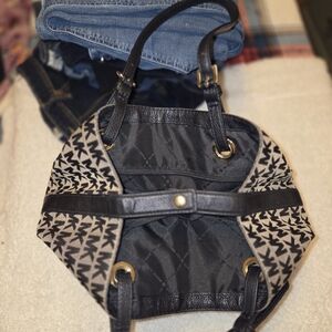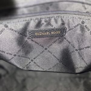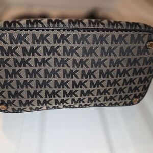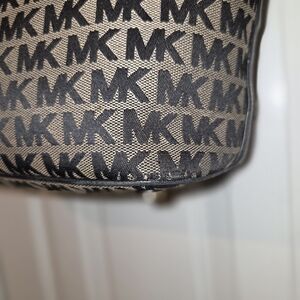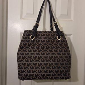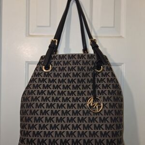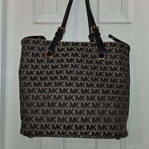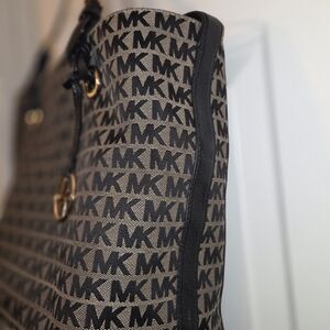 Keywords: Michael Kors, tote, purse, bag, shoulder bag, monogram print, Jacquard fabric, MK, designer, black and tan, jet set, signature.