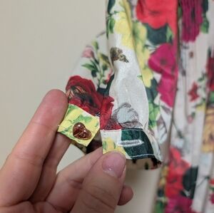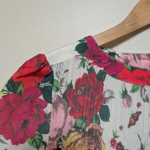 Beautiful Baker by Ted Baker blouse in a vibrant romantic floral print featuring roses, butterflies, and soft botanical details on a creamy ivory base. This piece has a lightweight, flowy feel with elegant vertical pleating through the body for soft movement and a flattering drape. The ¾-length sleeves are finished with dainty cuff tabs and rose-gold heart buttons for a subtle designer touch.