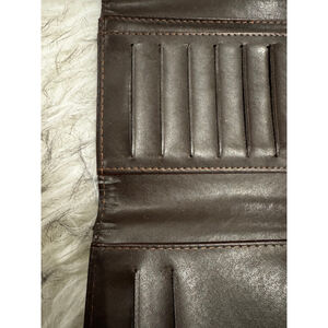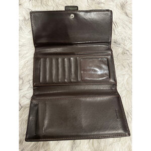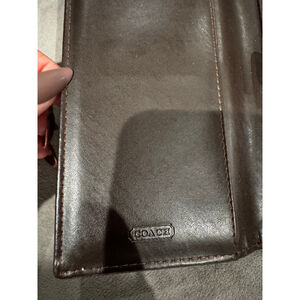 Authentic Coach signature canvas wallet in classic brown and beige with rich dark brown leather trim. Features a secure buckle snap closure and brass-tone hardware. Leather interior is embossed with the Coach logo and offers multiple card slots plus a clear ID window. Pre-owned with light, honest wear—minor canvas discoloration along the bottom edge and slight interior creasing consistent with normal use. Clean, functional, and ready to use.