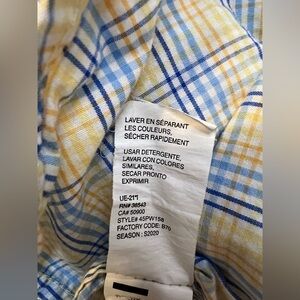 Excellent condition, no flaws. Classic Izod men’s long sleeve button-down shirt featuring a yellow, blue, and white plaid pattern. Button-down collar, front chest pocket with embroidered logo, and rounded hem. Made of 100% cotton for soft comfort.