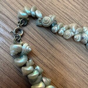 Natural shell bead necklace with beautiful iridescent sheen. Features small spiral shell beads strung throughout for a beachy, boho look. Lobster clasp closure. Perfect for summer outfits, vacations, or coastal style lovers.