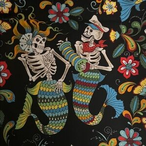 Vibrant fabric featuring skeleton mermaids and floral designs. Perfect for creative projects.