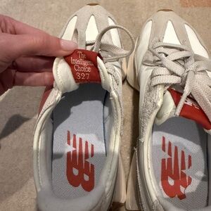 White, gray and red suede New Balance The Intelligent Choice 327 sneakers. Vintage-like coloring. Worn 2x, great condition!