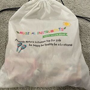 This kids' musical instrument set includes a variety of wooden instruments, perfect for budding musicians. The set features a tambourine, a xylophone, several shakers, and more, all can be neatly stored in a convenient bag. Encourage creativity and musical exploration with this fun and educational toy set.
