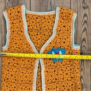 Beautiful handmade crochet vest featuring floral granny squares, butterfly appliqués, and a decorative button closure. Open-front style makes it perfect for layering. No brand, size, or fabric tag — handmade.