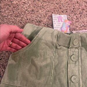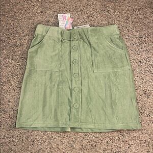 Stylish olive mini skirt with button-front design. Features convenient pockets. Perfect for casual outings.