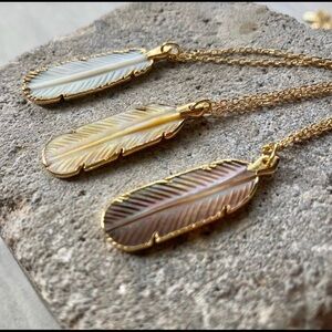 Chic and on trend carved shell boho feather pendant electroplated in 18k gold.