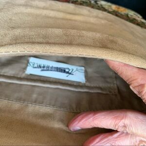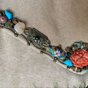This is a beautiful and unusual Mary Frances bag, it was purchased at a sample sale snd never carried. I don’t know that this design was Eve made do this might be a one up. It has beautiful embroidery at the bottom, the flap has semi precious stones and a coral rise surrounded by closinnie findings. Magnetic closure, pocket inside. Elegant and unique.