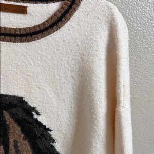 Elegant sweater with a bold horse design. Features cream and brown tones. Perfect for a chic look.