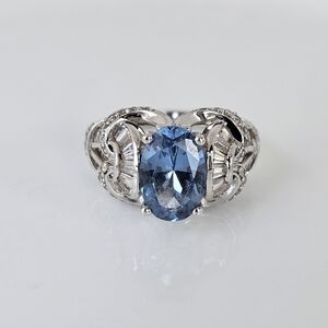 This is a very ornate designer Victoria Wieck London blue topaz with white absolute diamond simulant baguettes in an art deco design. It showcases a large London blue topaz in the center with a swirl of white diamond simulants sparkling in a rhodium over sterling silver setting. It is stamped with the designers hallmark and 925. Size 8