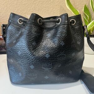 MCM BLACK VISETOS DRAWSTRING BUCKET BAG