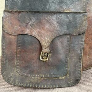 Features: Hand-stitched construction, buckle closure, double pouch design, rustic aged patina