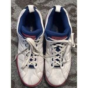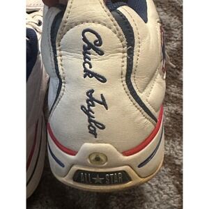 Keywords: Converse, Chuck Taylor, All Star, Leather Sneakers, White Shoes, Red and Blue, Athletic Shoes, Casual Shoes, Retro Sneakers, Court Shoes, Comfortable Sneakers