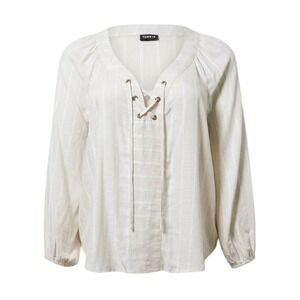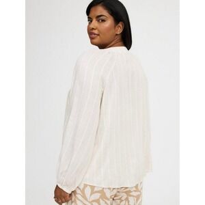 Torrid blouse in ivory featuring a subtle vertical stripe pattern. This top showcases a flattering V-neckline with a decorative lace-up detail and adjustable ties. The long sleeves are finished with elasticized cuffs, adding a touch of relaxed elegance. Crafted from a rayon woven fabric for a comfortable drape. Fits oversized and flowy, more like a 1X or 2X.