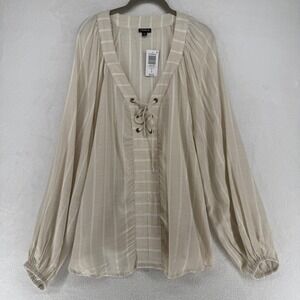 Torrid Lace Up V Neck Long Sleeve Blouse Ivory Stripe Size 0X L 12 Flowy NWT