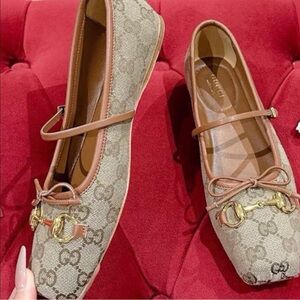 Stylish Gucci loafers in tan and brown. Features gold hardware and signature design. Ideal for a sophisticated look.