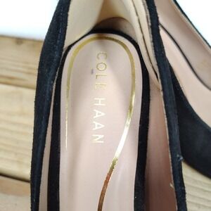 Elevate your style with this sleek black suede peep toe platform pump from Cole Haan. The slip-on design and low heel make it perfect for everyday wear, while the patent leather outsole adds a touch of shine. The pump is adorned with a Hann Black Suede Peep Toe Platform accent heel, giving it a unique and retro vibe.