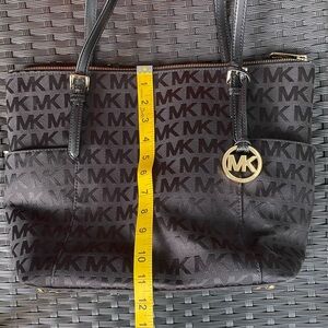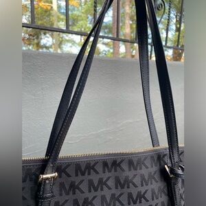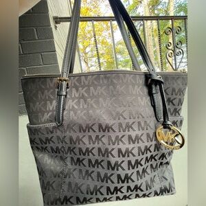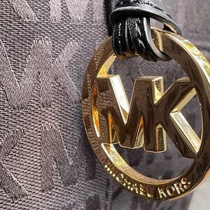 Elegant handbag with iconic MK pattern. Sleek and versatile design.