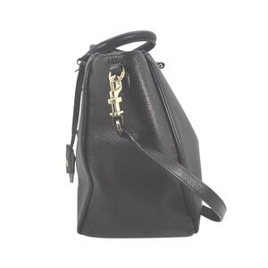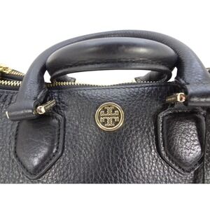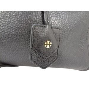 Keywords: Tory Burch handbag, black leather bag, gold hardware, designer satchel, pebbled leather, double zipper, logo emblem, convertible strap, luxury handbag, everyday bag, structured tote
