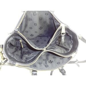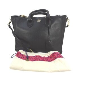 Tory Burch Robinson double zip black pebbled leather satchel tote bag by Tory Burch. This versatile bag features gold-tone hardware, dual top handles, and adjustable shoulder strap. The exterior is detailed with the iconic Tory Burch double T logo emblem on the front and a leather tag with a key ring inside. The interior has two zip closure sections. A center section has a side zip pocket and 2 slip pockets. Very clean. Dust bag included.