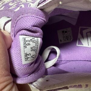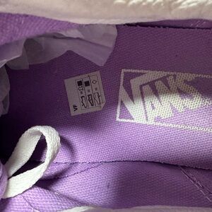 Great used condition Vans Old Skool Stacked Wavy Daze platform sneakers in women's size 9/men's 7.5. These shoes feature a sheer lilac suede and canvas shell, a trippy design side wall pattern, a white platform midsole, and a saw-edge designed sole. The heel panel is reinforced. Please see photos for any slight signs of wear. There is a small mark on the suede on the toe.