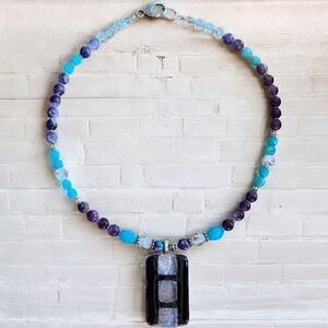 Blue & Silver Art Glass Dichloric pendant with genuine Larimar Faceted & Genuine Amethyst Hand Beaded Necklace 26”. 926 Sterling Sikver Closure Findings. Perfect to hard this handmade one of a kind piece to your forever jewelry Box. I handmake all my pieces!