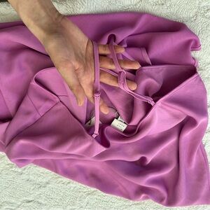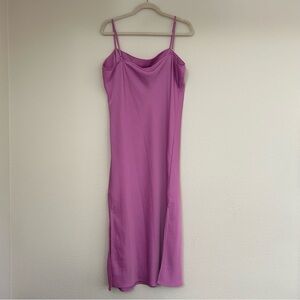 Beautiful brand new with tags lilac dress featuring adjustable spaghetti straps, a draped neckline, and longline maxi with slits on either side! Beautiful for spring and summer brunch, to layer with a kimono or jacket, or to pair with heels or boots!