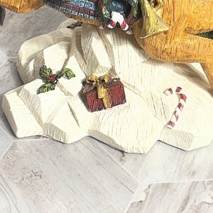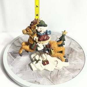 Hand-painted Christmas figurine by Hero Gift Professional featuring a cheerful snowman riding a reindeer over a snowy base. Detailed folk-art style carving with textured finish, holiday gifts, candy cane, and Christmas tree accents. Solid display piece with a rustic, vintage-inspired holiday look. Includes original box and foam packaging.