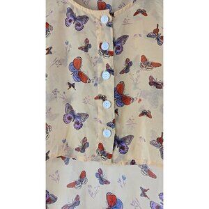 Colorful butterflys on a creamy yellow crop top in a semi-sheer fabric by Forever 21. Oversized with front buttons and a high-low hem. Very good condition.