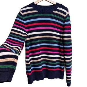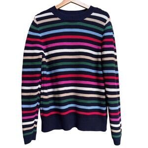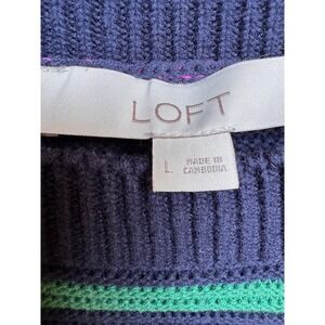 Keywords: striped sweater, colorful sweater, LOFT sweater, crew neck sweater, long sleeve sweater, pullover sweater, knit sweater, women's sweater, size L sweater, casual sweater, striped knit top, multicolored sweater, LOFT knitwear, classic sweater