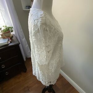 Elegant white lace top perfect for any occasion. Features intricate crocheted floral patterns for a stylish look. Very lacy, very feminine, fully lined. Put to pit measurement 21in. Just beautiful. Brand new with tags. Size Large.