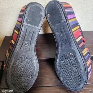 These are a pair of women's Geox wedges sandals. They are size 38 and are red and black in color. Super cool wedge with all kinds of rainbow colors.
