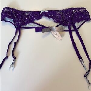 New with tags, Victoria’s Secret Purple and blue lace adjustable garter belt. 30 inches long. Leg straps can attach to tights. Size listed is M/L
