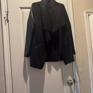Chic black blazer with satin-finish sleeves. Draped front design. Ideal for stylish layering.