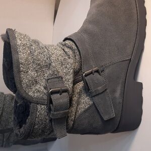 Bearpaws suede charcoal boots with buckle detail. Cozy and durable for winter wear. Never worn. in original box.