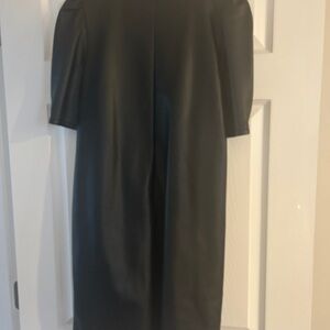 Elegant faux leather dress with stylish puff sleeves. Ideal for a modern look. Comes from a smoke free pet free home. Worn three times all to award shows for work. Always a hit a great length can also be a great piece for a wedding.