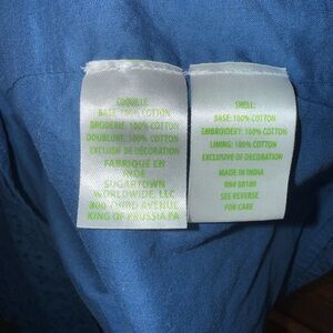 The Lilly Pulitzer Coretta Navy Tunic Top in size Large features a solid pattern with pink embroidery, making it a stylish and colorful addition to any wardrobe. This relaxed fit blouse has long balloon sleeves and a V-neckline, perfect for a breathable and comfortable look. Made from lightweight cotton chambray material, this tunic top is suitable for all seasons and embodies a beachy, bohemian, and preppy style. The designer brand Lilly Pulitzer adds a touch of sophistication to this versatile and feminine piece.