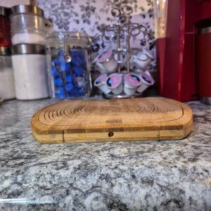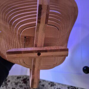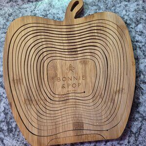 An empty re usable wooden basket from" Bonnie and Pop, NY". It is cut from one piece of wood and goes from flat to form a basket that can be used for display or gifting. Locking pin on bottom to secure in place. Very unique and genius design. I feel sure although you can re use it that you must handle it gently? I was impressed after finding the business while researching the item. Nice gifts.