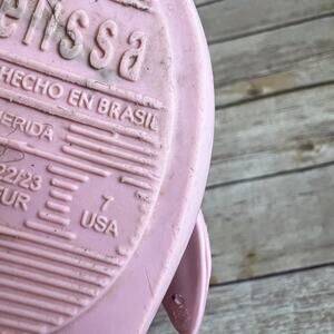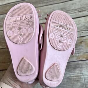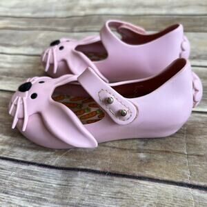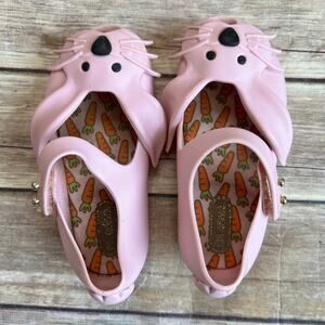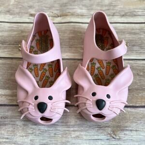 Size 7, Mini Melissa, Pink Ultragirl Rabbit Jelly Shoes. The perfect shoes for your little bunny to hop around in this Spring. Egg-cellent shoes for an egg hunt. Rabbit face. Bunny tail at back heel. Grip-hook strap with stud detail. Snipped toe. Carrot print insoles. Textured rubber pads on outsole. Signature tutti-fruiti bubblegum scent. Very minimal wear. Very good used condition.