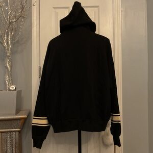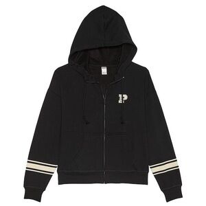 PINK Victoria’s Secret Ivy Fleece Campus Full-Zip Hoodie. Zip up hoodie featuring a funnel neck, white stripes on sleeves and PINK logo on chest. Size: XL. Color: Black. Materials: 76% Cotton, 24% Polyester. New with tag