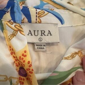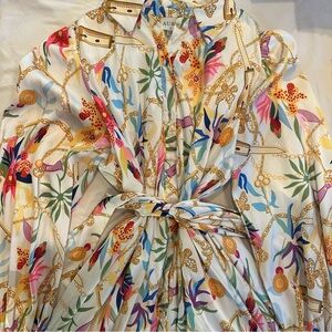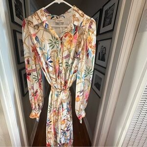 Chic long sleeve dress with vibrant floral patterns. Features a flowing silhouette and button-up front. Ideal for stylish outings. Love this dress, wore a handful of times for events. Ready to swap for something else.