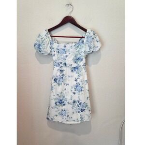 Altar State floral puff sleeve mini dress featuring a charming blue and white floral print. This dress showcases a flattering square neckline, playful puff sleeves, a cinched waist detail, and an alluring cutout back with a tie closure. The smocked back bodice ensures a comfortable and adjustable fit.